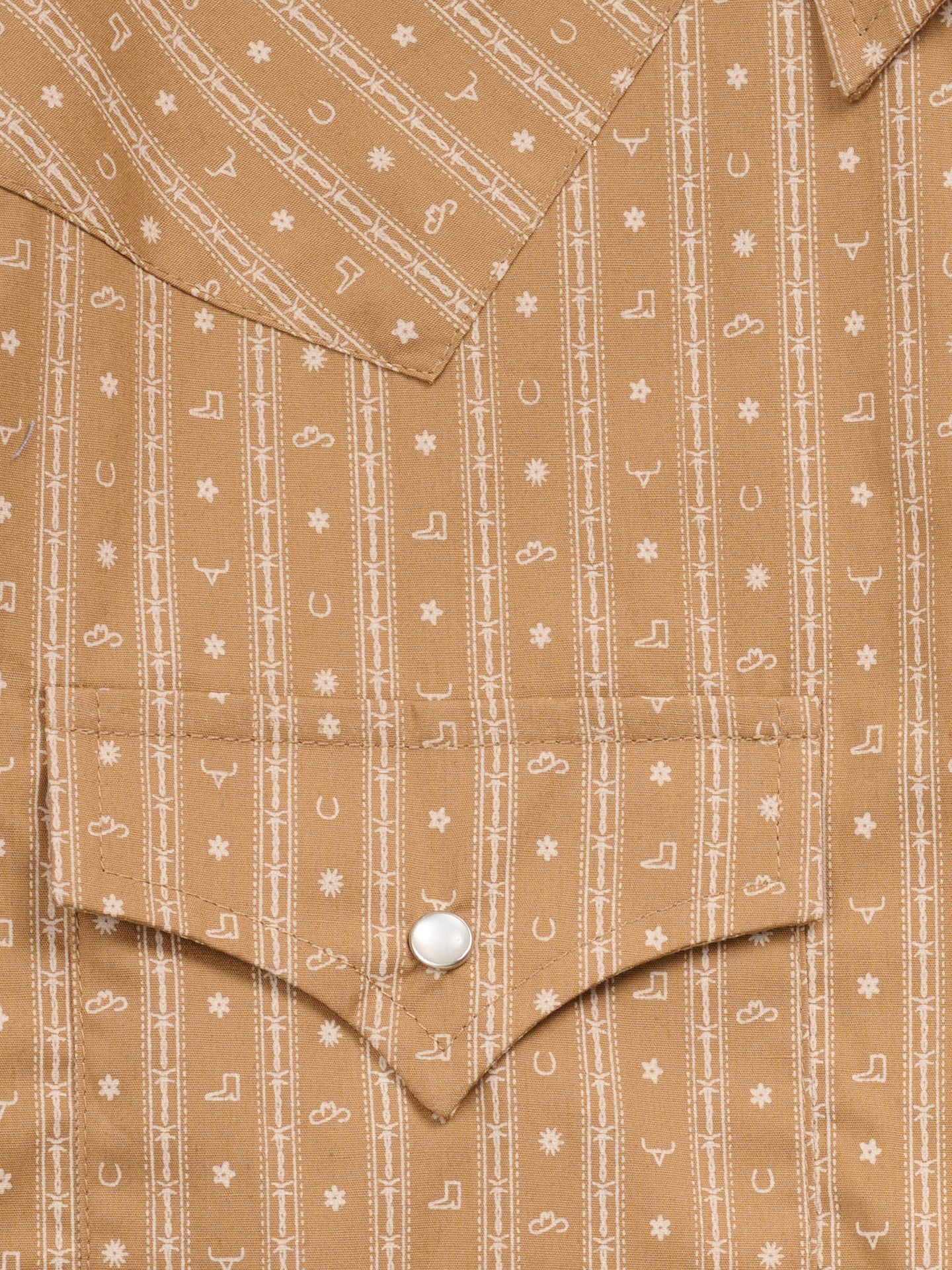 Add standout western style to your wardrobe with this Men’s Cotton Barbed Wire Print Long Sleeve Western Snap Shirt in gold. Designed for those who like classic western details with a bold, modern twist, this shirt delivers eye-catching style while staying true to timeless western tradition.