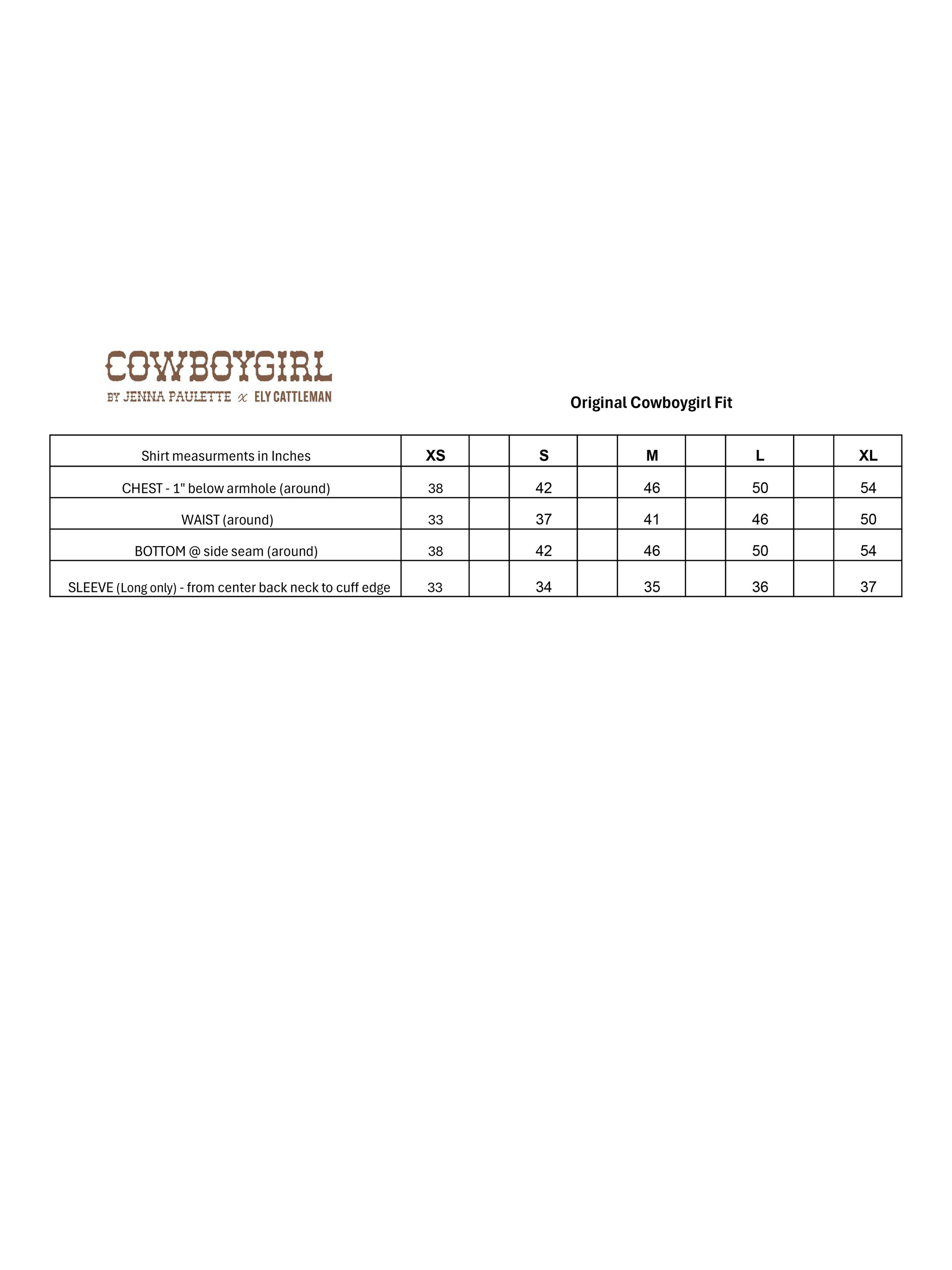 *Original Cowboygirl Fit – sizes M, L, and XL are looser in the body width and shoulders than the Fall 2025 Fit. Refer to the measurement chart within each shirt listing's photos for the best fit. (Sizes XS and S are unchanged.)