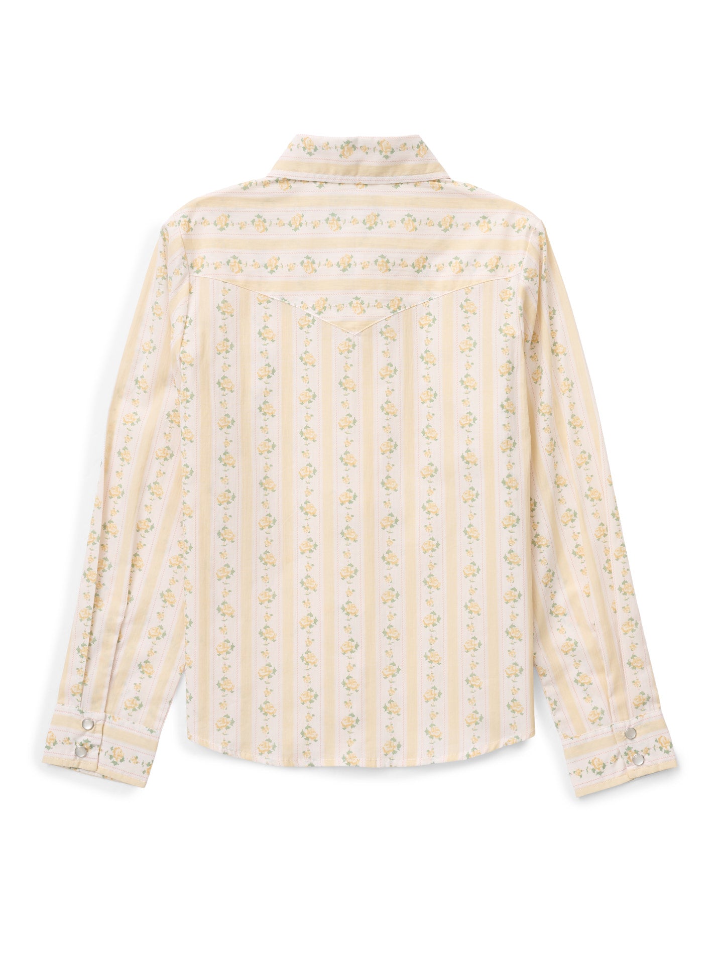 Built for little Cowboygirls, this Girl's Buttermilk Rose Print Shirt is ready to be on the ground crew, get the gate, or tag along for the gather, all while looking pretty. Crafted in breathable lightweight cotton voile, with western yokes, flap pockets, and pearl snaps, she will feel just like one of the big Cowboygirls!