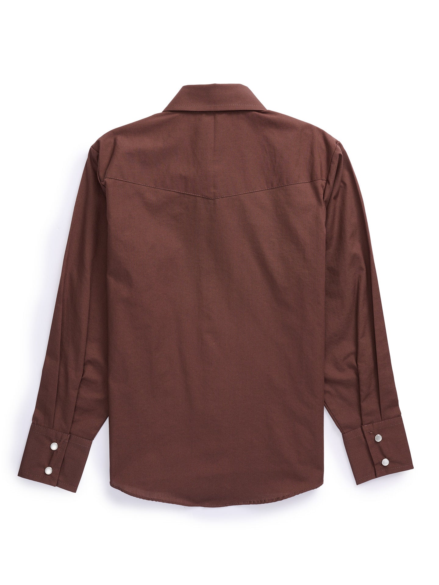 Classic western style made just for him. This boys’ long-sleeve western shirt features a solid brown design with traditional pearl snap buttons, pointed yokes, and double chest flap pockets. Built for comfort and durability, it’s perfect for school, family outings, or the rodeo arena.
