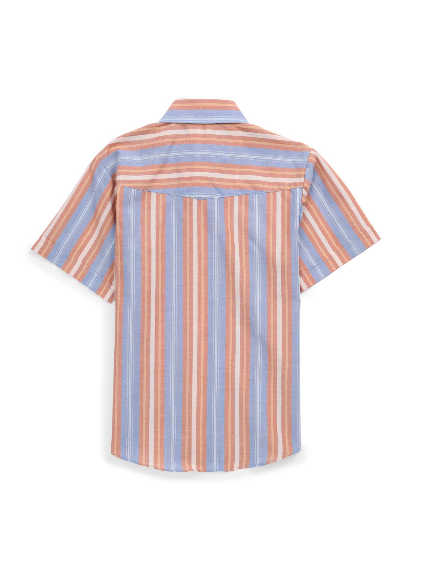 A kid-sized take on a classic, the Boys’ Retro Blue Stripe Western Snap Shirt features bold blue and copper striping with authentic western details. Designed with snap-front closures, pointed yokes, and a comfortable short-sleeve fit, it’s perfect for everyday wear, special occasions, or matching dad in true western style.