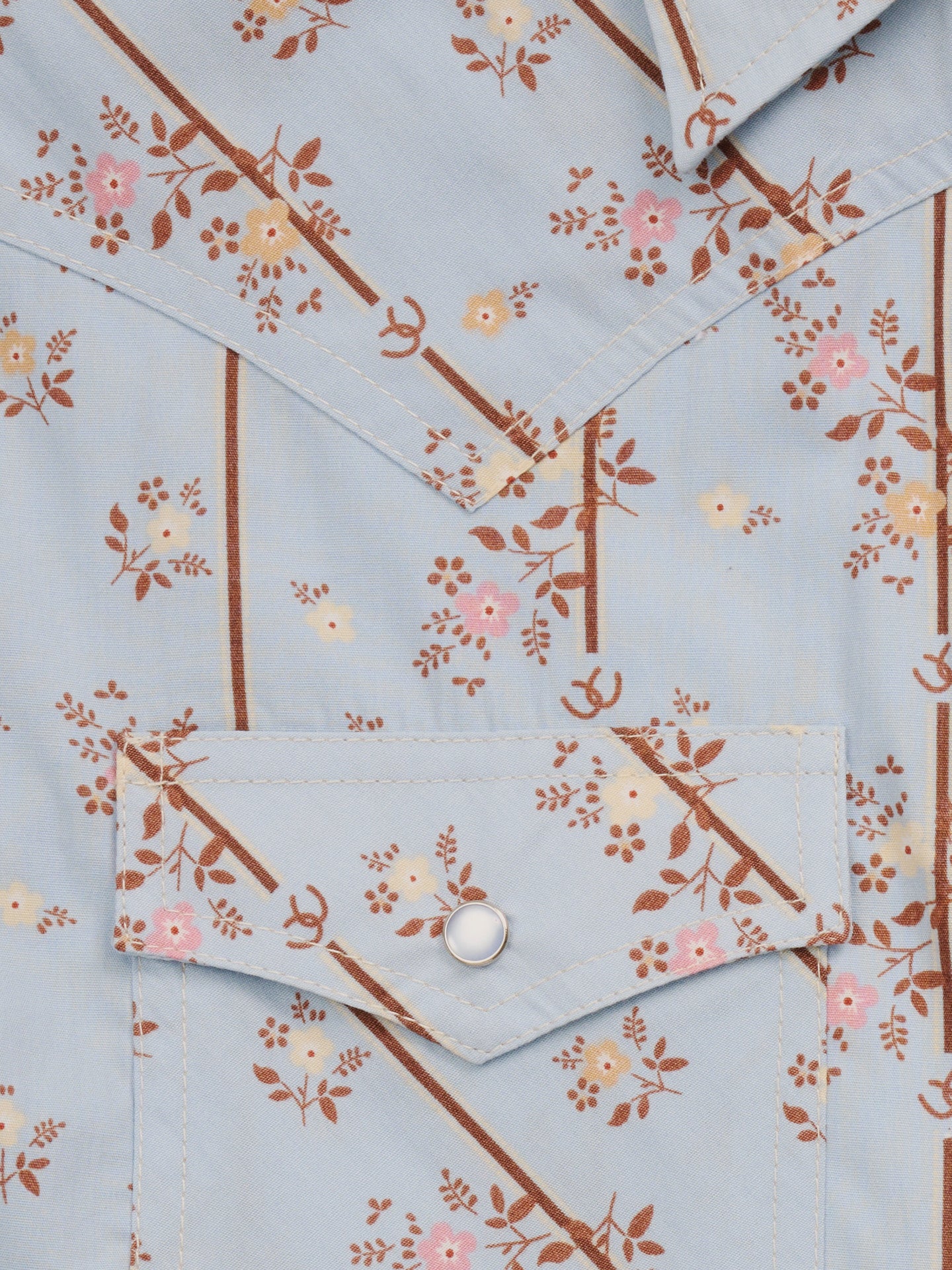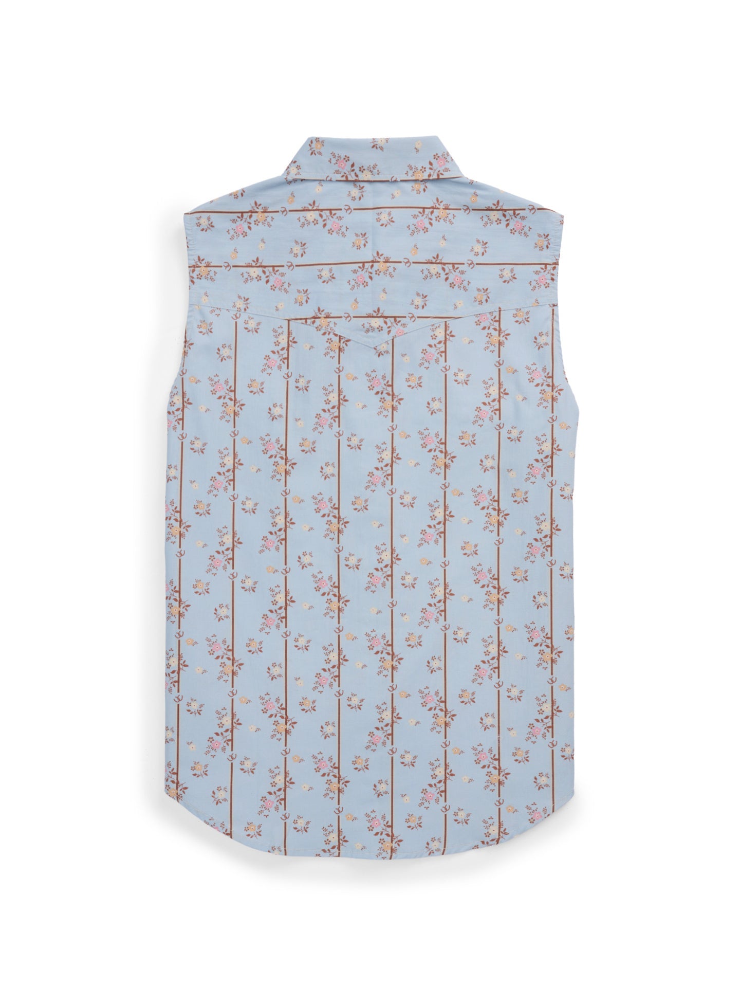 Soft, feminine, and effortlessly Western, this Women’s Sleeveless Horseshoe Floral Snap Shirt brings timeless charm to your everyday style. Designed in a stone blue fabric with delicate floral and stripe detailing, it offers a fresh take on classic cowgirl fashion. Pearl snap buttons, pointed yokes, and flap chest pockets add authentic Western flair, while the sleeveless cut keeps you cool and comfortable.