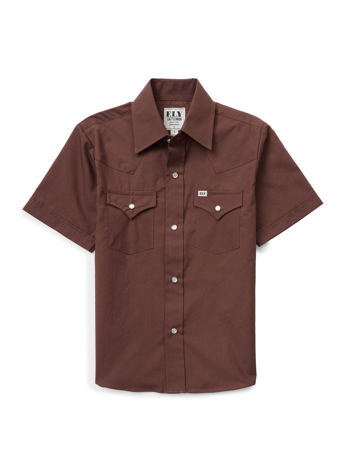 Classic western style made just for him. This boys’ short-sleeve western shirt features a solid brown design with traditional pearl snap buttons, pointed yokes, and double chest flap pockets. Built for comfort and durability, it’s perfect for school, family outings, or the rodeo arena.
