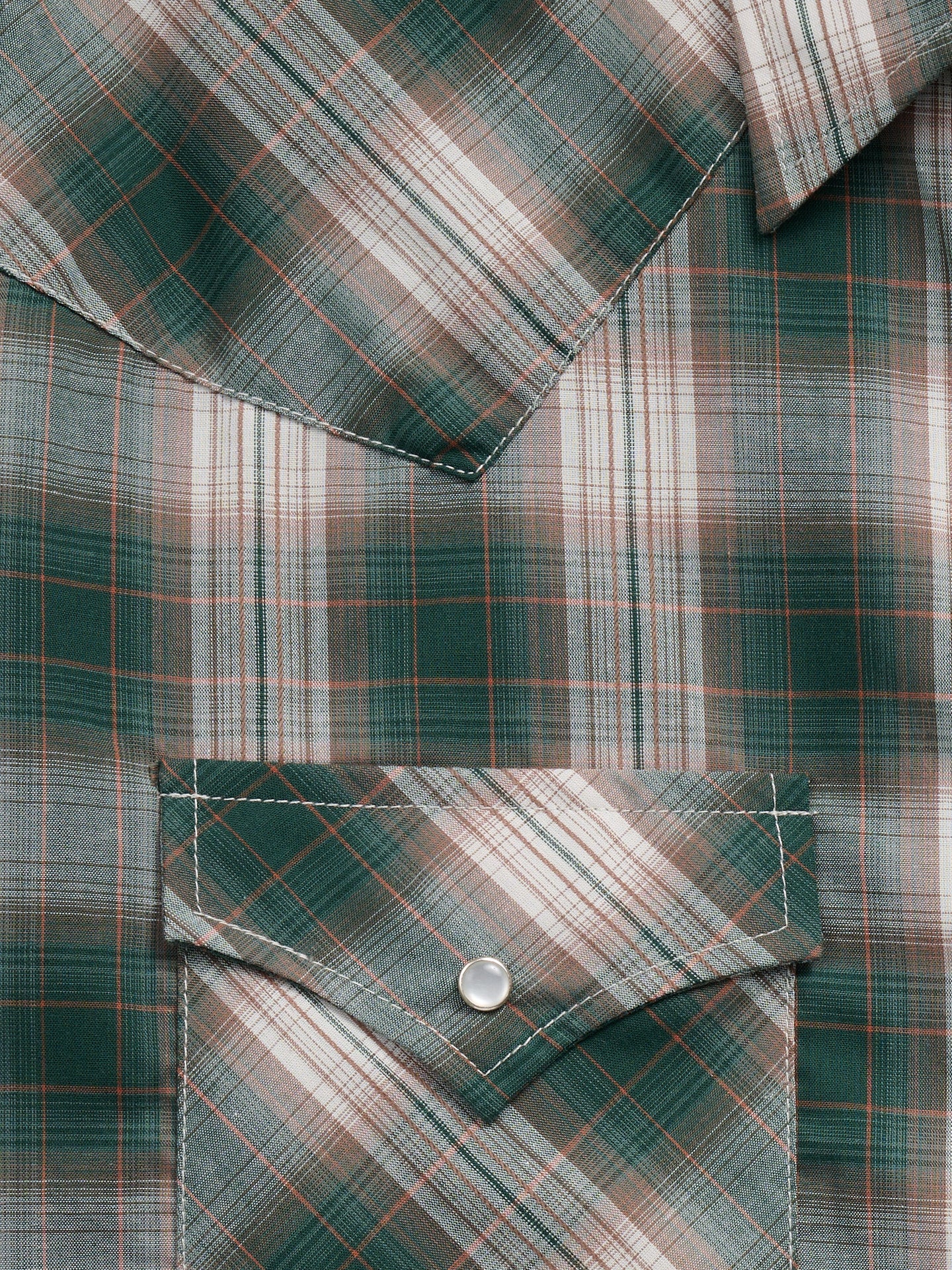 A timeless western classic with rugged style. This men’s long-sleeve shirt features a green plaid pattern, pearl snap buttons, and traditional western yokes. Designed with double flap chest pockets and snap cuffs, it delivers the perfect blend of authenticity and comfort. Whether you’re headed to work, a night out, or the rodeo, this shirt pairs effortlessly with jeans and boots for a true cowboy look.